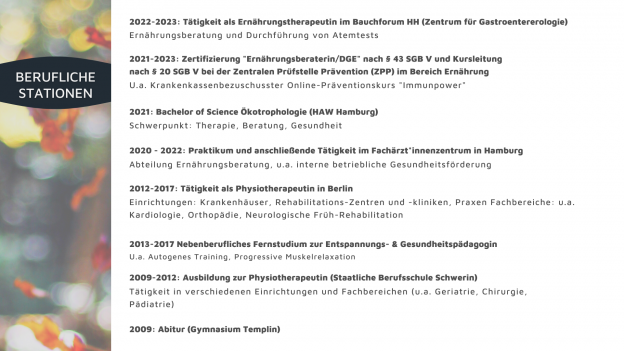 Das führte mich dann vor einigen Jahren weg aus Berlin, zu meinem Ökotrophologie-Studium nach Hamburg. Durch die Vertiefung im Bereich Prävention durch Ernährung und entsprechende Beratung hat sich mein "Werkzeugkoffer" erheblich erweitert.